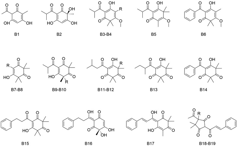 B4 | 3-Hydroxy-5-methoxy-4,6,6-trimethyl-2-(2-methyl-1-oxopropyl)-2,4-cyclohexadien-1-one | CH3 |